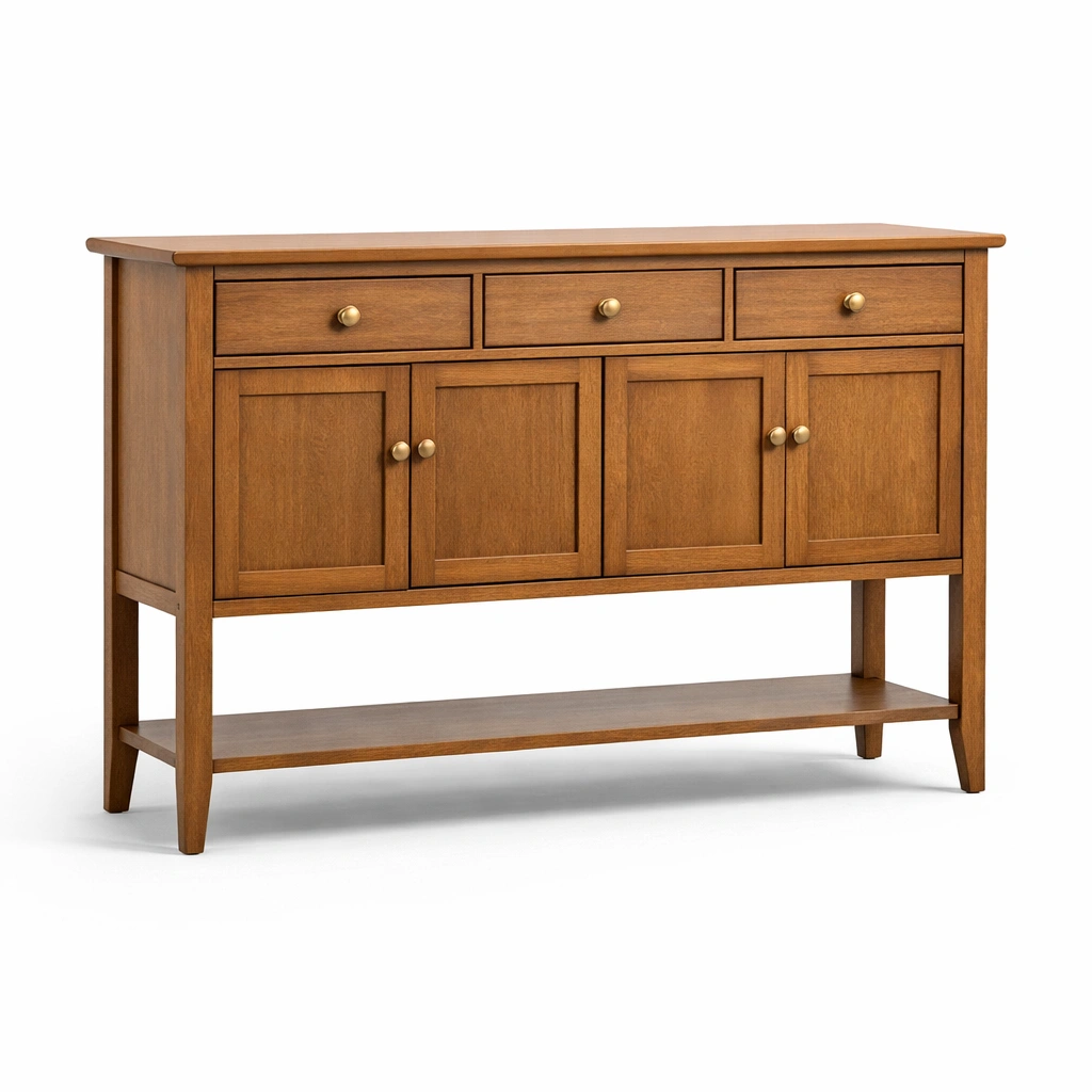 Die Struktur umfasst 3 Schubladen, 4 Türen und ein Bodenregal. Zur Wartung genügt eine regelmäßige Reinigung mit einem weichen Tuch.